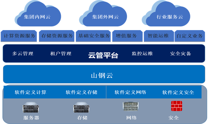 “山钢云”是基于开放、先进的OpenStack云平台基础框架,采用KVM、SDN、VXLAN等虚拟化、云计算、网络管理相关技术进行整体构建的企业级云平台,通过统一云管系统,全方位为山钢集团信息化建设提供云资源服务,促进信息化实施的模式转变,为山钢集团产业协同、数据共享提供有力的平台支撑,推动企业的数字化转型,带动企业模式创新。同时,以企业云平台为基础推动大数据平台、移动互联平台、工业互联网等平台的研发应用,利用IDC资质为社会提供高附加值的云服务,成为新的经济增长点。