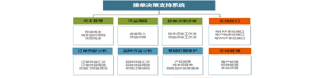 接单决策支持系统是面向企业订单的,基于成本和价格体系的多维订单效益测算系统,从接单前的询单效益测算,生产中的产线订单效益分析,到结算后订单的品种效益评价,形成一套闭环的订单效益测算机制,助力企业建立以订单效益为导向,以优化营销管理和资源配置为目标的管理模式。